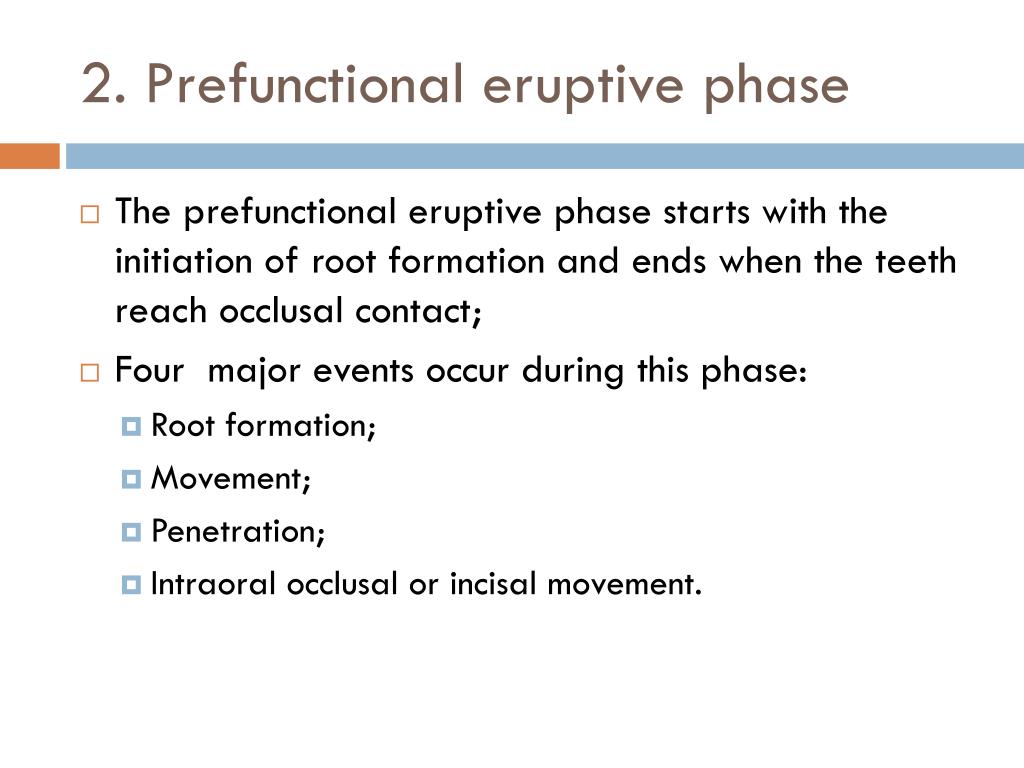 2. Prefunctional eruptive phase • The prefunctional eruptive phase starts with the initiation of root formation and ends when the teeth reach occlusal contact; • Four major events occur during this phase: • Root formation; • Movement; • Penetration; • Intraoral occlusal or incisal movement.