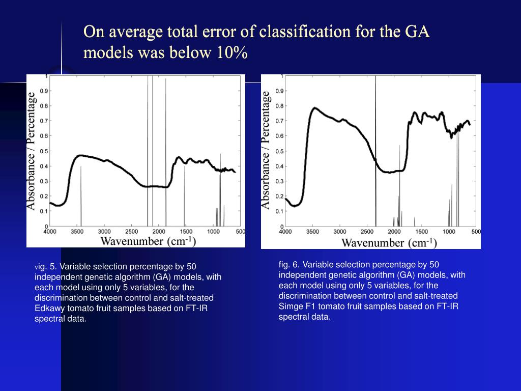 On average total error of classification for the GA models was below 10% fig. 6. Variable selection percentage by 50 independent genetic algorithm (GA) models, with each model using only 5 variables, for the discrimination between control and salt-treated Simge F1 tomato fruit samples based on FT-IR spectral data. vig. 5. Variable selection percentage by 50 independent genetic algorithm (GA) models, with each model using only 5 variables, for the discrimination between control and salt-treated Edkawy tomato fruit samples based on FT-IR spectral data.