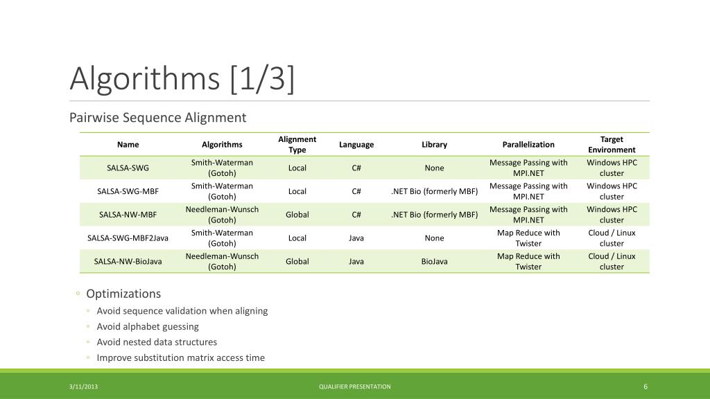 Algorithms [1/3] • Pairwise Sequence Alignment • Optimizations • Avoid sequence validation when aligning • Avoid alphabet guessing • Avoid nested data structures • Improve substitution matrix access time Qualifier Presentation