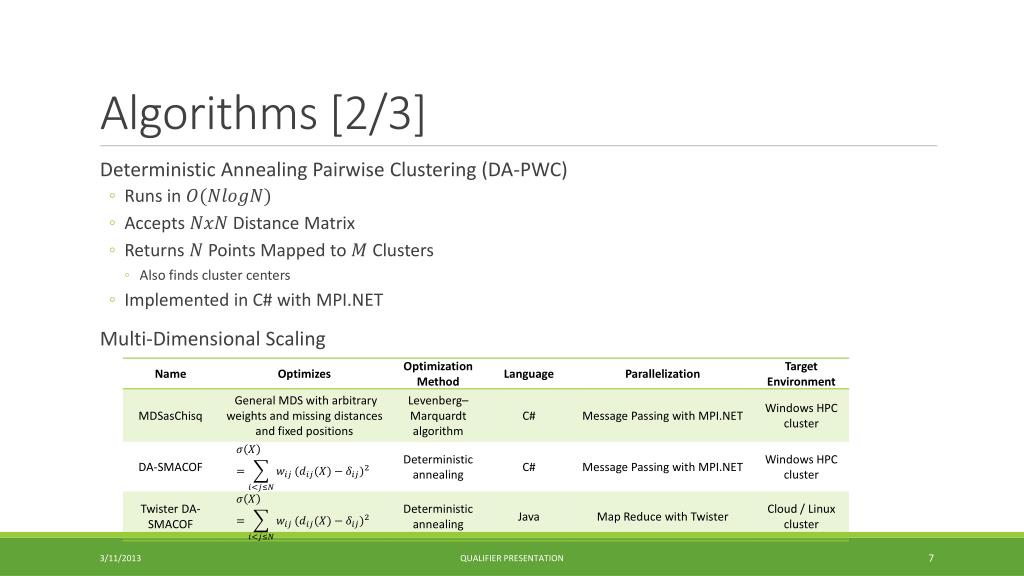 Algorithms [2/3] • Deterministic Annealing Pairwise Clustering (DA-PWC) • Runs in • Accepts Distance Matrix • Returns Points Mapped to Clusters • Also finds cluster centers • Implemented in C# with MPI.NET • Multi-Dimensional Scaling Qualifier Presentation