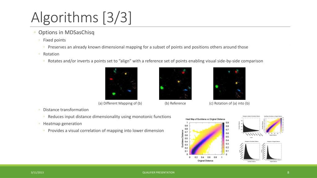 Algorithms [3/3] • Options in MDSasChisq • Fixed points • Preserves an already known dimensional mapping for a subset of points and positions others around those • Rotation • Rotates and/or inverts a points set to “align” with a reference set of points enabling visual side-by-side comparison • Distance transformation • Reduces input distance dimensionality using monotonic functions • Heatmap generation • Provides a visual correlation of mapping into lower dimension (a) Different Mapping of (b) (b) Reference (c) Rotation of (a) into (b) Qualifier Presentation