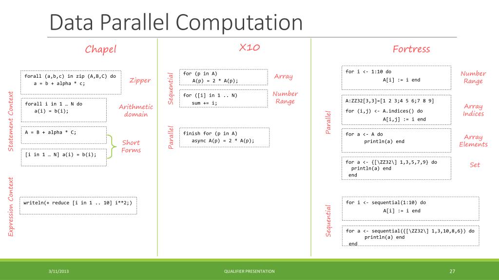 Data Parallel Computation X10 Fortress Chapel for i <- 1:10 do A[i] := i end Number Range for (p in A) A(p) = 2 * A(p); forall (a,b,c) in zip (A,B,C) do a = b + alpha * c; Array Zipper Sequential Number Range for ([i] in 1 .. N) sum += i; A:ZZ32[3,3]=[1 2 3;4 5 6;7 8 9] for (i,j) <- A.indices() do A[i,j] := i end forall i in 1 … N do a(i) = b(i); Array Indices Arithmetic domain Statement Context Parallel A = B + alpha * C; finish for (p in A) async A(p) = 2 * A(p); for a <- A do println(a) end Array Elements Parallel Short Forms [i in 1 … N] a(i) = b(i); for a <- {[\ZZ32\] 1,3,5,7,9} do println(a) end end Set for i <- sequential(1:10) do A[i] := i end writeln(+ reduce [i in 1 .. 10] i**2;) Expression Context Sequential for a <- sequential({[\ZZ32\] 1,3,10,8,6}) do println(a) end end Qualifier Presentation