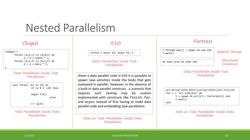 Nested Parallelism Fortress X10 Chapel T:Thread[\Any\] = spawn do exp end T.wait() cobegin { forall (a,b,c) in (A,B,C) do a = b + alpha * c; forall (d,e,f) in (D,E,F) do d = e + beta * f; } Explicit Thread finish { async S1; async S2; } Structural Construct Data Parallelism Inside Task Parallelism do exp1 also do exp2 end Data Parallelism Inside Task Parallelism Data Parallelism Inside Task Parallelism Given a data parallel code in X10 it is possible to spawn new activities inside the body that gets evaluated in parallel. However, in the absence of a built-in data parallel construct, a scenario that requires such nesting may be custom implemented with constructs like finish, for, and async instead of first having to make data parallel code and embedding task parallelism sync forall (a) in (A) do if (a % 5 ==0) then begin f(a); else a = g(a); arr:Array[\ZZ32,ZZ32\]=array[\ZZ32\](4).fill(id) for i <- arr.indices() do t = spawn do arr[i]:= factorial(i) end t.wait() end Task Parallelism Inside Data Parallelism Note on Task Parallelism Inside Data Parallelism Note on Task Parallelism Inside Data Parallelism Qualifier Presentation