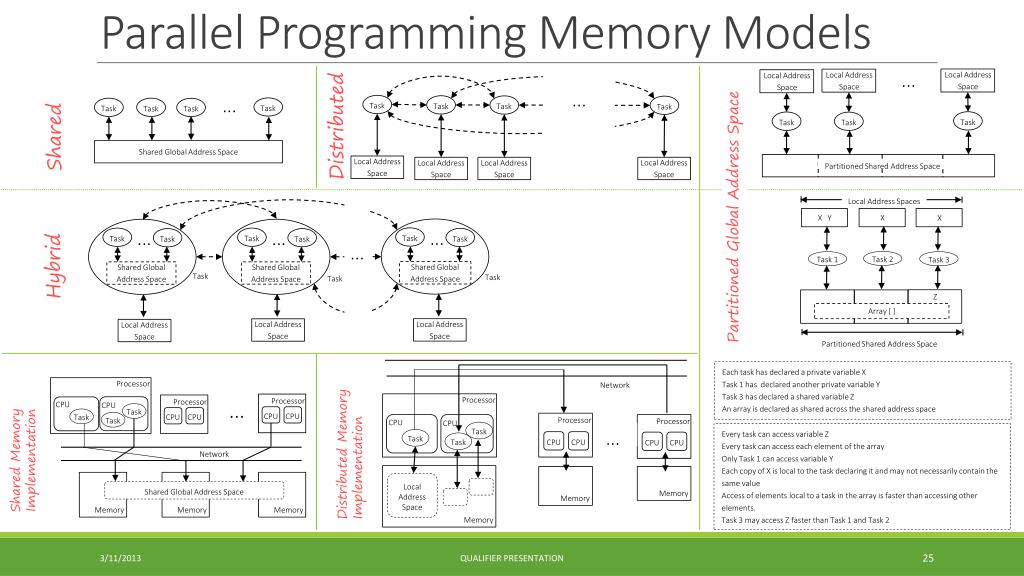 ... ... Local Address Space Local Address Space Local Address Space Task Task Task Task Processor Network Parallel Programming Memory Models ... Processor ... Processor CPU CPU Processor Task Task Task Task ... ... ... Task Task Task Task Task Task Task CPU CPU CPU CPU Task Task Task Task Shared Global Address Space Task ... Processor CPU Processor CPU Task ... Task CPU CPU CPU CPU Task Shared Global Address Space Shared Global Address Space Shared Global Address Space Task Task Task Network Partitioned Shared Address Space Local Address Space Local Address Space Local Address Space Local Address Space Shared Memory Memory Memory Distributed Local Address Space Memory Memory Memory Shared Global Address Space Local Address Space Local Address Space Local Address Space Local Address Spaces Partitioned Global Address Space X X Y X Hybrid Task 2 Task 1 Task 3 Z Array [ ] Partitioned Shared Address Space • Each task has declared a private variable X • Task 1 has declared another private variable Y • Task 3 has declared a shared variable Z • An array is declared as shared across the shared address space Shared Memory Implementation • Every task can access variable Z • Every task can access each element of the array • Only Task 1 can access variable Y • Each copy of X is local to the task declaring it and may not necessarily contain the same value • Access of elements local to a task in the array is faster than accessing other elements. • Task 3 may access Z faster than Task 1 and Task 2 Distributed Memory Implementation Qualifier Presentation