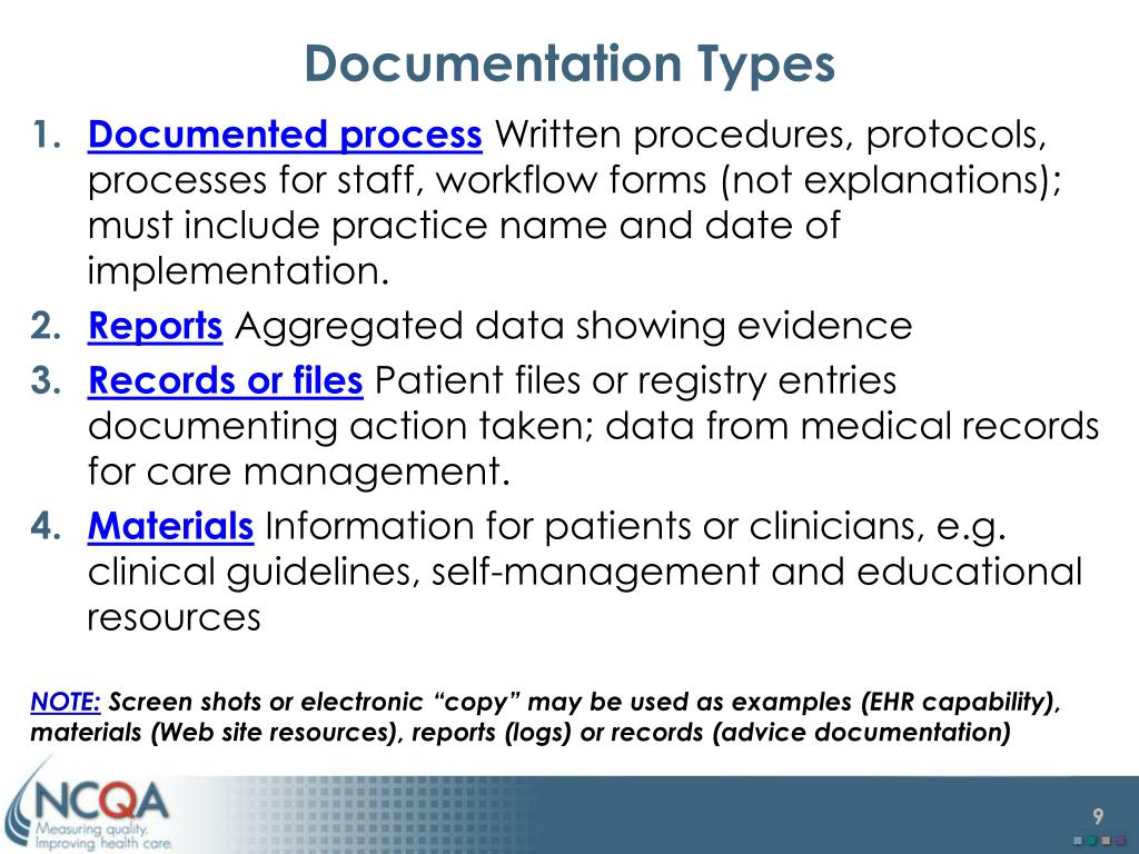 Documentation Types • Documented processWritten procedures, protocols, processes for staff, workflow forms (not explanations); must include practice name and date of implementation. • ReportsAggregated data showing evidence • Records or filesPatient files or registry entries documenting action taken; data from medical records for care management. • MaterialsInformation for patients or clinicians, e.g. clinical guidelines, self-management and educational resources NOTE:Screen shots or electronic “copy” may be used as examples (EHR capability), materials (Web site resources), reports (logs) or records (advice documentation)