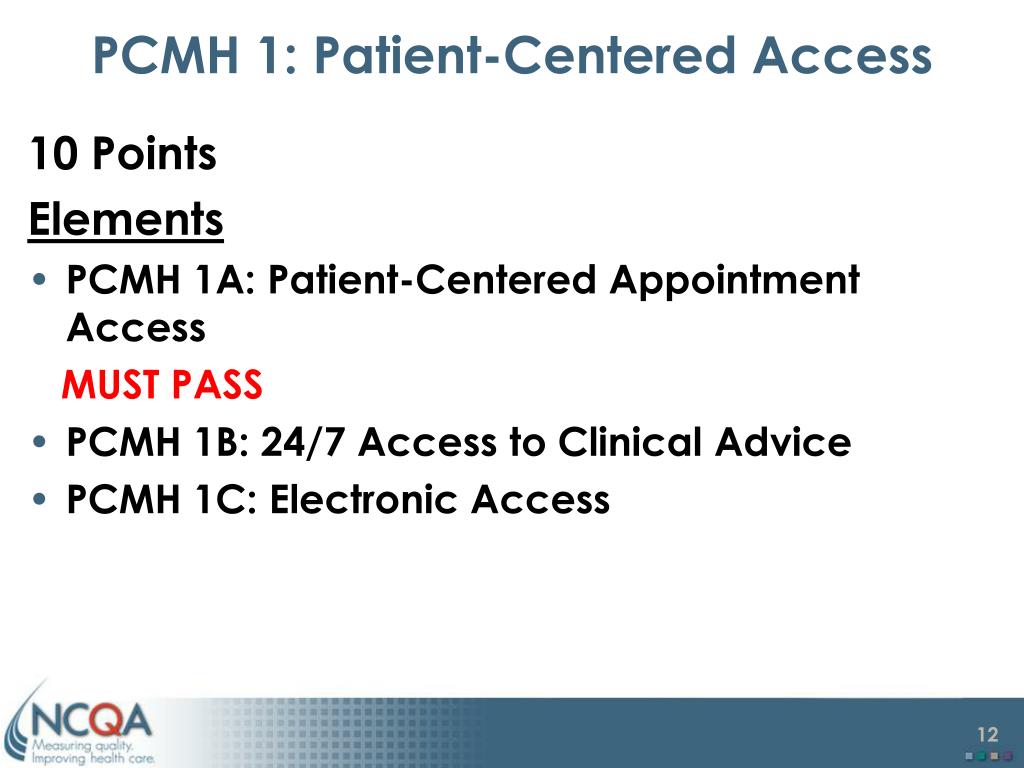 PCMH 1: Patient-Centered Access 10 Points Elements • PCMH 1A: Patient-Centered Appointment Access MUST PASS • PCMH 1B: 24/7 Access to Clinical Advice • PCMH 1C: Electronic Access