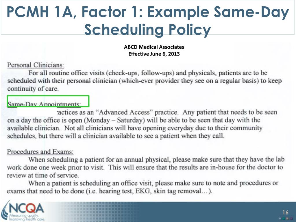 PCMH 1A: Patient-Centered Access The practice has a written process and defined standards for providing access to appointments, and regularly assesses its performance on: • Providing routine and urgent same-day appointments – CRITICAL FACTOR • Providing routine and urgent-care appointments outside regular business hours • Providing alternative types of clinical encounters • Availability of appointments • Monitoring no-show rates • Acting on identified opportunities to improve access NOTE: Critical Factors in a Must Pass element are essential for Recognition