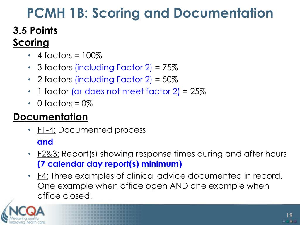 PCMH 1B: Scoring and Documentation 3.5 Points Scoring • 4 factors = 100% • 3 factors (including Factor 2) = 75% • 2 factors (including Factor 2) = 50% • 1 factor (or does not meet factor 2) = 25% • 0 factors = 0% Documentation • F1-4: Documented process and • F2&3: Report(s) showing response times during and after hours (7 calendar day report(s) minimum) • F4: Three examples of clinical advice documented in record. One example when office open AND one example when office closed.