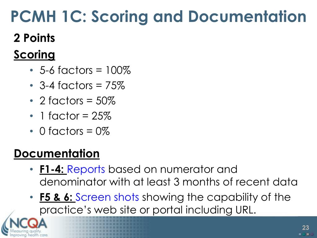 PCMH 1C: Scoring and Documentation 2 Points Scoring • 5-6 factors = 100% • 3-4 factors = 75% • 2 factors = 50% • 1 factor = 25% • 0 factors = 0% Documentation • F1-4: Reportsbased on numerator and denominator with at least 3 months of recent data • F5 & 6: Screen shots showing the capability of the practice’s web site or portal including URL.