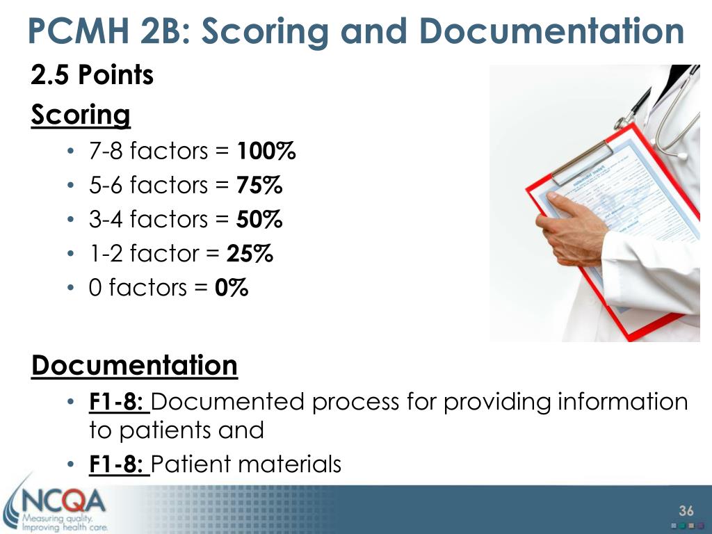 PCMH 2B: Scoring and Documentation 2.5 Points Scoring • 7-8 factors = 100% • 5-6 factors = 75% • 3-4 factors = 50% • 1-2 factor = 25% • 0 factors = 0% Documentation • F1-8: Documented process for providing information to patients and • F1-8: Patient materials