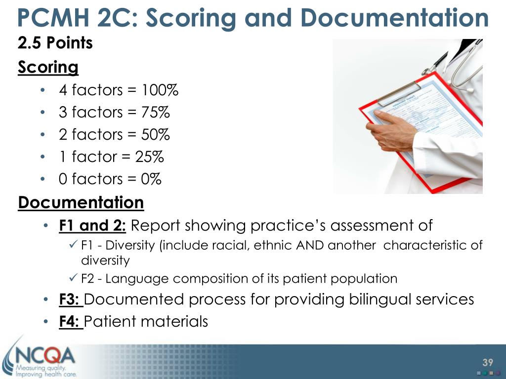 PCMH 2C: Scoring and Documentation 2.5 Points Scoring • 4 factors = 100% • 3 factors = 75% • 2 factors = 50% • 1 factor = 25% • 0 factors = 0% Documentation • F1 and 2:Report showing practice’s assessment of • F1 - Diversity (include racial, ethnic AND another characteristic of diversity • F2 - Language composition of its patient population • F3: Documented process for providing bilingual services • F4: Patient materials