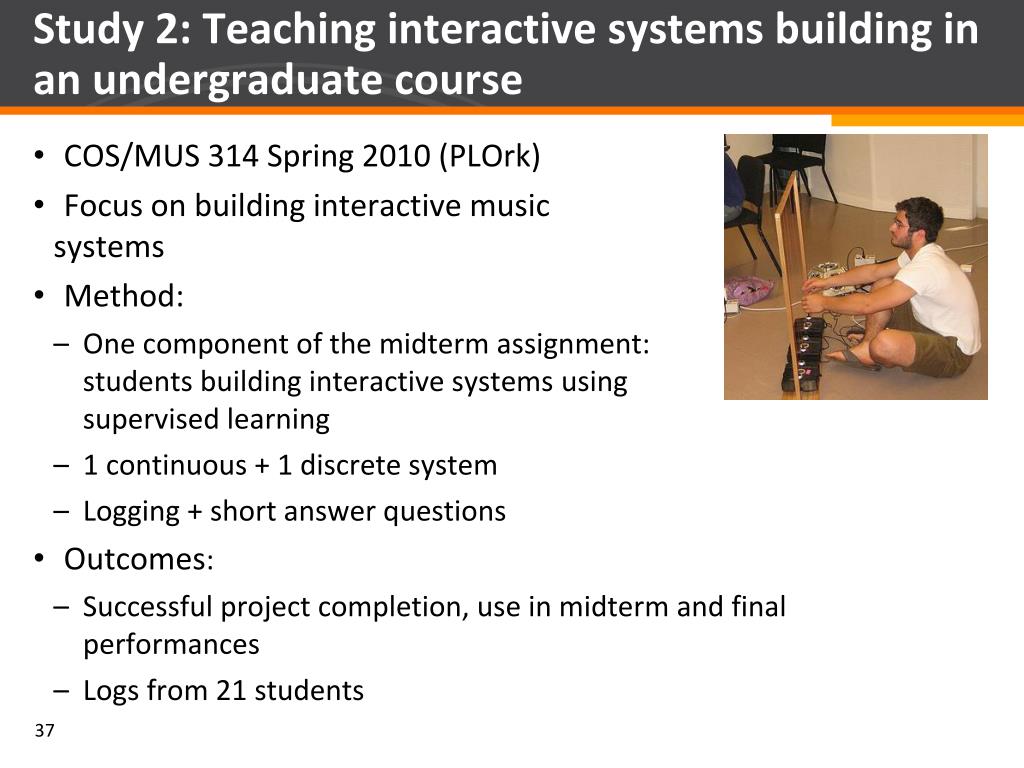 Study 2: Teaching interactive systems building in an undergraduate course • COS/MUS 314 Spring 2010 (PLOrk) • Focus on building interactive music systems • Method: • One component of the midterm assignment:students building interactive systems using supervised learning • 1 continuous + 1 discrete system • Logging + short answer questions • Outcomes: • Successful project completion, use in midterm and final performances • Logs from 21 students
