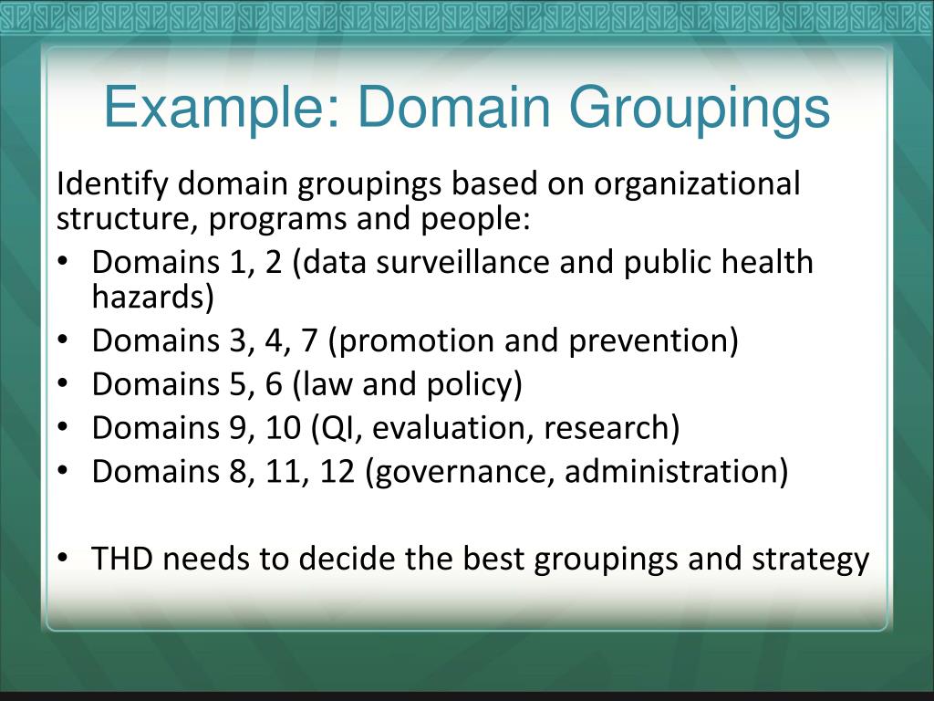Example: Domain Groupings Identify domain groupings based on organizational structure, programs and people: • Domains 1, 2 (data surveillance and public health hazards) • Domains 3, 4, 7 (promotion and prevention) • Domains 5, 6 (law and policy) • Domains 9, 10 (QI, evaluation, research) • Domains 8, 11, 12 (governance, administration) • THD needs to decide the best groupings and strategy
