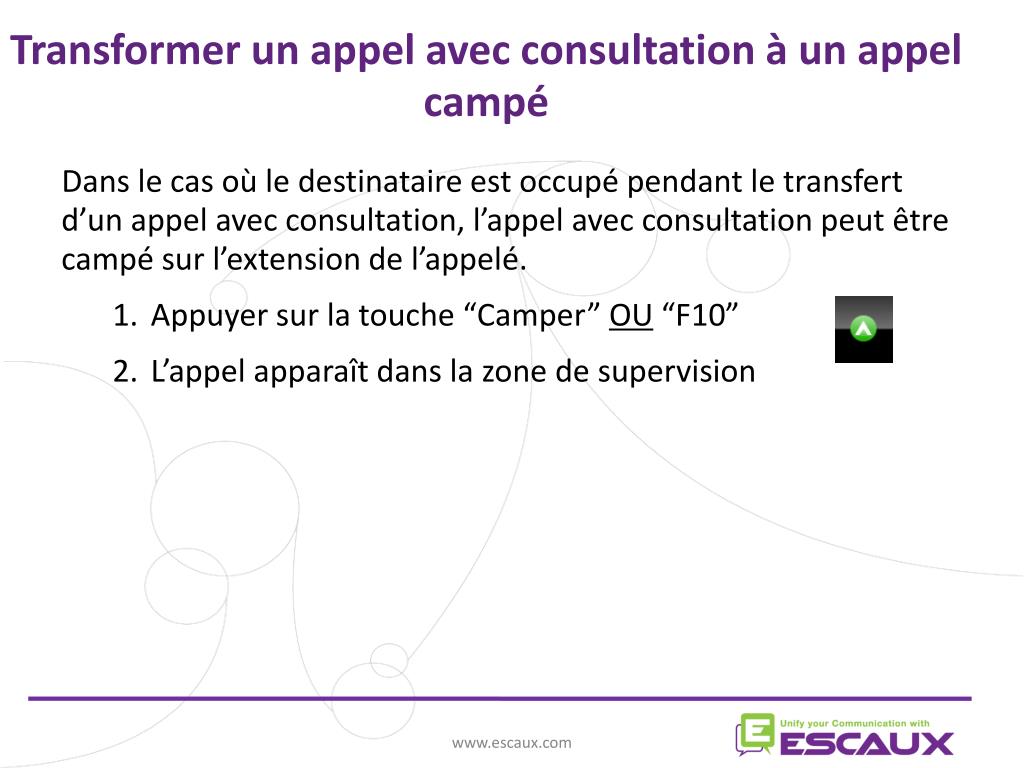 Transformer un appel avec consultation à un appel campé Dans le cas où le destinataire est occupé pendant le transfert d’un appel avec consultation, l’appel avec consultation peut être campé sur l’extension de l’appelé. • Appuyer sur la touche “Camper” OU “F10” • L’appel apparaît dans la zone de supervision www.escaux.com