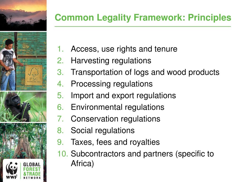 Common Legality Framework: Principles • Access, use rights and tenure • Harvesting regulations • Transportation of logs and wood products • Processing regulations • Import and export regulations • Environmental regulations • Conservation regulations • Social regulations • Taxes, fees and royalties • Subcontractors and partners (specific to Africa)