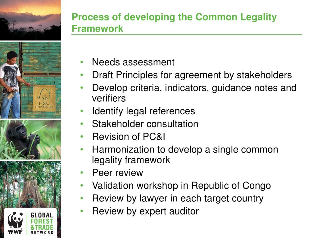 Process of developing the Common Legality Framework • Needs assessment • Draft Principles for agreement by stakeholders • Develop criteria, indicators, guidance notes and verifiers • Identifylegal references • Stakeholder consultation • Revision of PC&I • Harmonization to develop a single common legality framework • Peer review • Validation workshop in Republic of Congo • Review by lawyer in each target country • Review by expert auditor