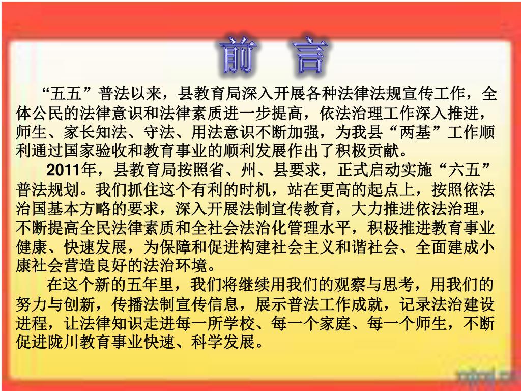 前 言 “五五”普法以来,县教育局深入开展各种法律法规宣传工作,全体公民的法律意识和法律素质进一步提高,依法治理工作深入推进,师生、家长知法、守法、用法意识不断加强,为我县“两基”工作顺利通过国家验收和教育事业的顺利发展作出了积极贡献。 2011年,县教育局按照省、州、县要求,正式启动实施“六五”普法规划。我们抓住这个有利的时机,站在更高的起点上,按照依法治国基本方略的要求,深入开展法制宣传教育,大力推进依法治理,不断提高全民法律素质和全社会法治化管理水平,积极推进教育事业健康、快速发展,为保障和促进构建社会主义和谐社会、全面建成小康社会营造良好的法治环境。 在这个新的五年里,我们将继续用我们的观察与思考,用我们的努力与创新,传播法制宣传信息,展示普法工作成就,记录法治建设进程,让法律知识走进每一所学校、每一个家庭、每一个师生,不断促进陇川教育事业快速、科学发展。