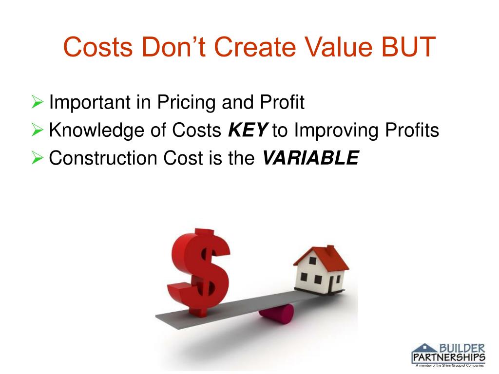 Costs Don’t Create Value BUT • Important in Pricing and Profit • Knowledge of Costs KEY to Improving Profits • Construction Cost is the VARIABLE