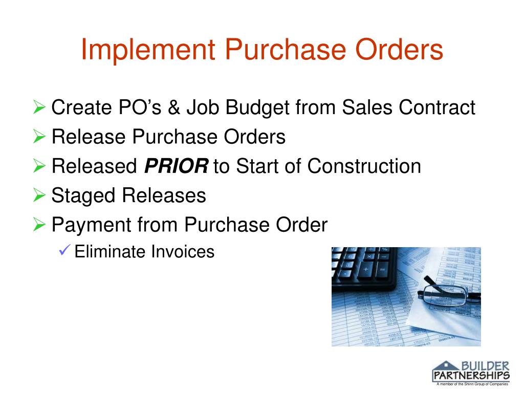 Implement Purchase Orders • Create PO’s & Job Budget from Sales Contract • Release Purchase Orders • Released PRIOR to Start of Construction • Staged Releases • Payment from Purchase Order • Eliminate Invoices