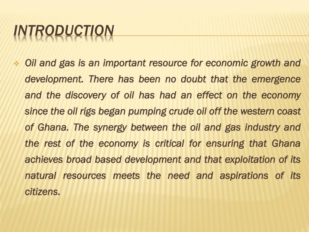 Oil and gas is an important resource for economic growth and development. There has been no doubt that the emergence and the discovery of oil has had an effect on the economy since the oil rigs began pumping crude oil off the western coast of Ghana. The synergy between the oil and gas industry and the rest of the economy is critical for ensuring that Ghana achieves broad based development and that exploitation of its natural resources meets the need and aspirations of its citizens. INTRODUCTION
