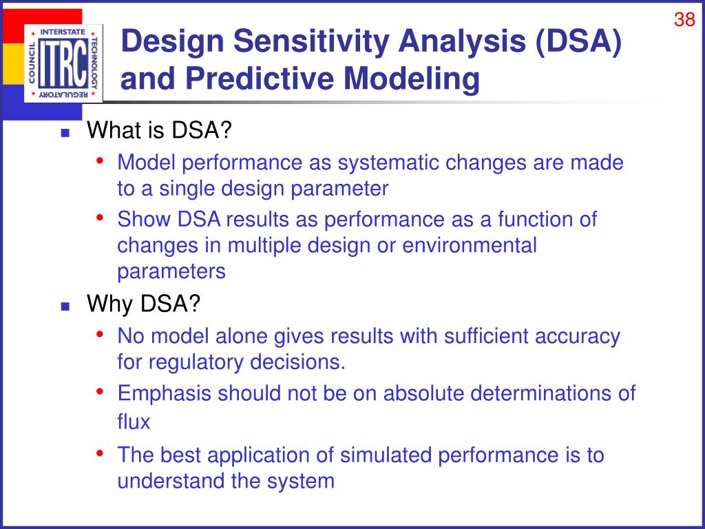 Design Sensitivity Analysis (DSA) and Predictive Modeling • What is DSA? • Model performance as systematic changes are made to a single design parameter • Show DSA results as performance as a function of changes in multiple design or environmental parameters • Why DSA? • No model alone gives results with sufficient accuracy for regulatory decisions. • Emphasis should not be on absolute determinations of flux • The best application of simulated performance is to understand the system