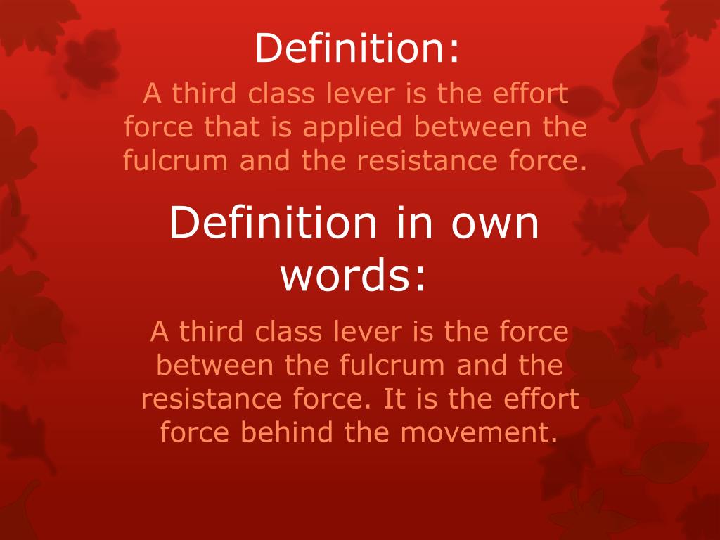 Definition in own words: Definition: A third class lever is the force between the fulcrum and the resistance force. It is the effort force behind the movement. A third class lever is the effort force that is applied between the fulcrum and the resistance force.