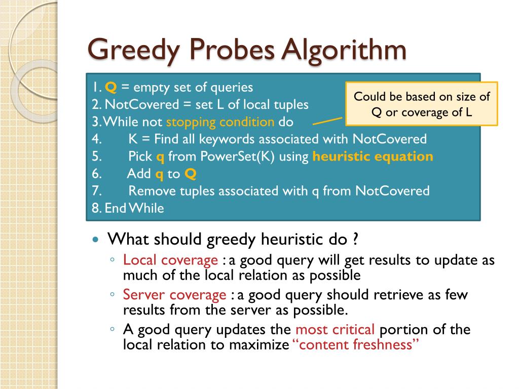 Greedy Probes Algorithm 1. Q = empty set of queries 2. NotCovered = set L of local tuples 3. While not stopping condition do 4. K = Find all keywords associated with NotCovered 5. Pick q from PowerSet(K) using heuristic equation 6. Add q to Q 7. Remove tuples associated with q from NotCovered 8. End While • What should greedy heuristic do ? • Local coverage : a good query will get results to update as much of the local relation as possible • Server coverage : a good query should retrieve as few results from the server as possible. • A good query updates the most critical portion of the local relation to maximize “content freshness” Could be based on size of Q or coverage of L