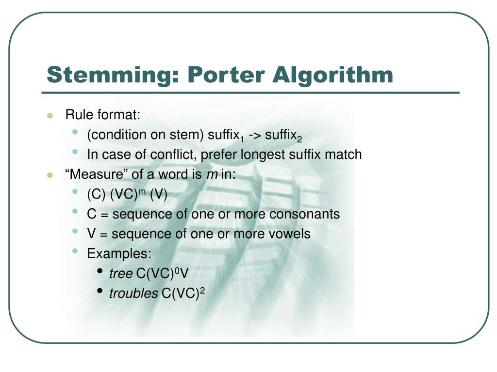 Stemming: Porter Algorithm • Rule format: • (condition on stem) suffix1 -> suffix2 • In case of conflict, prefer longest suffix match • “Measure” of a word is m in: • (C) (VC)m (V) • C = sequence of one or more consonants • V = sequence of one or more vowels • Examples: • tree C(VC)0V • troubles C(VC)2
