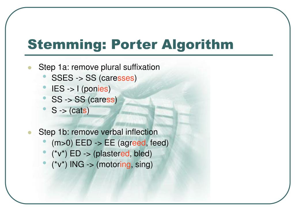 Stemming: Porter Algorithm • Step 1a: remove plural suffixation • SSES -> SS (caresses) • IES -> I (ponies) • SS -> SS (caress) • S -> (cats) • Step 1b: remove verbal inflection • (m>0) EED -> EE (agreed, feed) • (*v*) ED -> (plastered, bled) • (*v*) ING -> (motoring, sing)