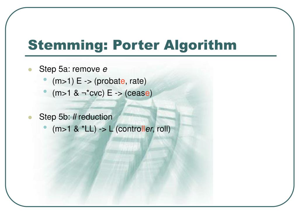 Stemming: Porter Algorithm • Step 5a: remove e • (m>1) E -> (probate, rate) • (m>1 & ¬*cvc) E -> (cease) • Step 5b: ll reduction • (m>1 & *LL) -> L (controller, roll)