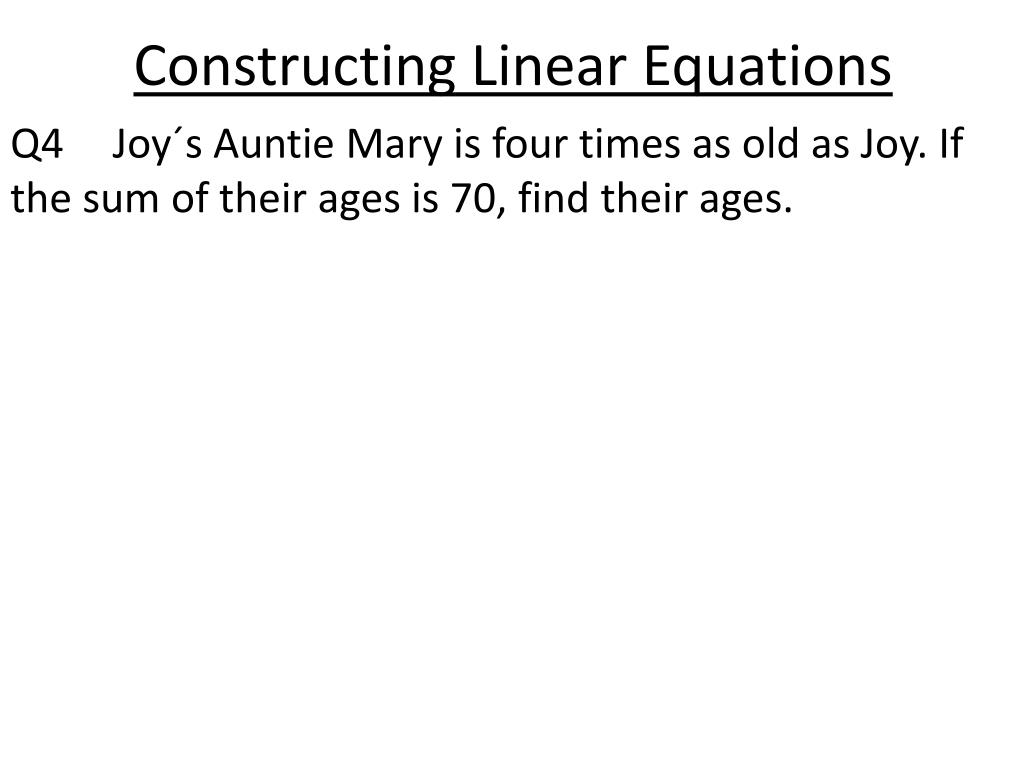 Constructing Linear Equations Q4 Joy´sAuntieMary is four times as old as Joy. Ifthe sum oftheir ages is 70, findtheir ages.