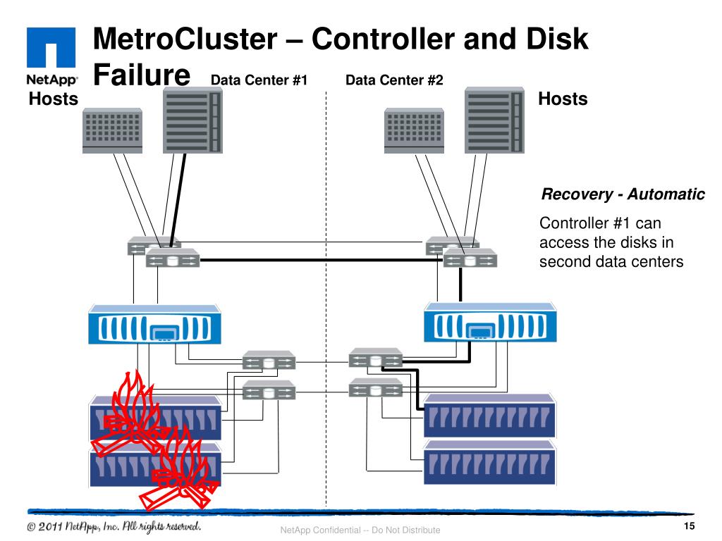 MetroCluster – Controller Failure Data Center #1 Data Center #2 Hosts Hosts Recovery - Automatic Controller #2 can access the disks in both data centers NetApp Confidential -- Do Not Distribute