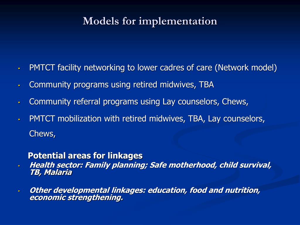 Models for implementation • PMTCT facility networking to lower cadres of care (Network model) • Community programs using retired midwives, TBA • Community referral programs using Lay counselors, Chews, • PMTCT mobilization with retired midwives, TBA, Lay counselors, Chews, Potential areas for linkages • Health sector: Family planning; Safe motherhood, child survival, TB, Malaria • Other developmental linkages: education, food and nutrition, economic strengthening.