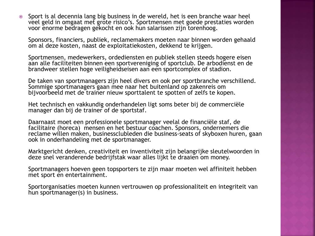 Sport is al decennia lang big business in de wereld, het is een branche waar heel veel geld in omgaat met grote risico’s. Sportmensen met goede prestaties worden voor enorme bedragen gekocht en ook hun salarissen zijn torenhoog. Sponsors, financiers, publiek, reclamemakers moeten naar binnen worden gehaald om al deze kosten, naast de exploitatiekosten, dekkend te krijgen. Sportmensen, medewerkers, ordediensten en publiek stellen steeds hogere eisen aan alle faciliteiten binnen een sportvereniging of sportclub. De arbodienst en de brandweer stellen hoge veiligheidseisen aan een sportcomplex of stadion. De taken van sportmanagers zijn heel divers en ook per sportbranche verschillend. Sommige sportmanagers gaan mee naar het buitenland op zakenreis om bijvoorbeeld met de trainer nieuw sporttalent te spotten of zelfs te kopen.Het technisch en vakkundig onderhandelen ligt soms beter bij de commerciële manager dan bij de trainer of de sportstaf. Daarnaast moet een professionele sportmanager veelal de financiële staf, de facilitaire (horeca) mensen en het bestuur coachen. Sponsors, ondernemers die reclame willen maken, businessclubleden die business-seats of skyboxen huren, gaan ook in onderhandeling met de sportmanager. Marktgericht denken, creativiteit en inventiviteit zijn belangrijke sleutelwoorden in deze snel veranderende bedrijfstak waar alles lijkt te draaien om money. Sportmanagers hoeven geen topsporters te zijn maar moeten wel affiniteit hebben met sport en entertainment.Sportorganisaties moeten kunnen vertrouwen op professionaliteit en integriteit van hun sportmanager(s) in business.