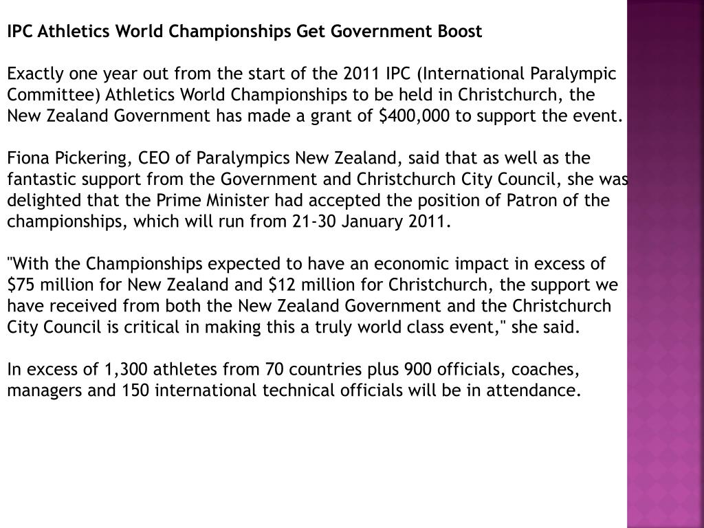 IPC Athletics World Championships Get Government Boost Exactly one year out from the start of the 2011 IPC (International Paralympic Committee) Athletics World Championships to be held in Christchurch, the New Zealand Government has made a grant of $400,000 to support the event.Fiona Pickering, CEO of Paralympics New Zealand, said that as well as the fantastic support from the Government and Christchurch City Council, she was delighted that the Prime Minister had accepted the position of Patron of the championships, which will run from 21-30 January 2011."With the Championships expected to have an economic impact in excess of $75 million for New Zealand and $12 million for Christchurch, the support we have received from both the New Zealand Government and the Christchurch City Council is critical in making this a truly world class event," she said.In excess of 1,300 athletes from 70 countries plus 900 officials, coaches, managers and 150 international technical officials will be in attendance.