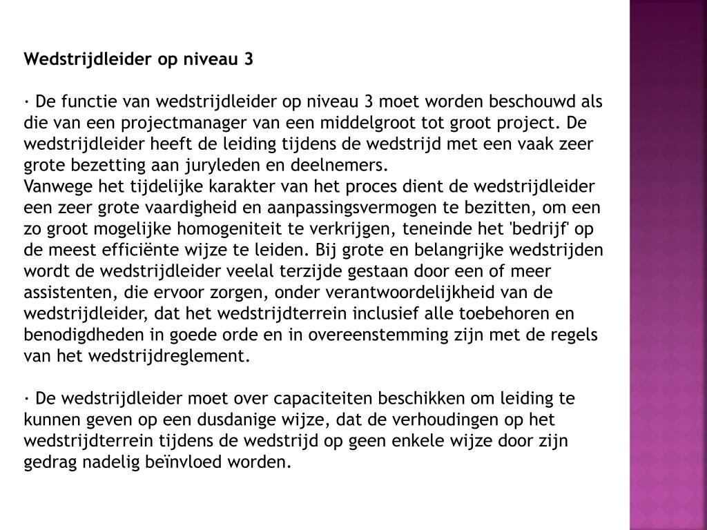 Wedstrijdleider op niveau 3 · De functie van wedstrijdleider op niveau 3 moet worden beschouwd als die van een projectmanager van een middelgroot tot groot project. De wedstrijdleider heeft de leiding tijdens de wedstrijd met een vaak zeer grote bezetting aan juryleden en deelnemers. Vanwege het tijdelijke karakter van het proces dient de wedstrijdleider een zeer grote vaardigheid en aanpassingsvermogen te bezitten, om een zo groot mogelijke homogeniteit te verkrijgen, teneinde het 'bedrijf' op de meest efficiënte wijze te leiden. Bij grote en belangrijke wedstrijden wordt de wedstrijdleider veelal terzijde gestaan door een of meer assistenten, die ervoor zorgen, onder verantwoordelijkheid van de wedstrijdleider, dat het wedstrijdterrein inclusief alle toebehoren en benodigdheden in goede orde en in overeenstemming zijn met de regels van het wedstrijdreglement. · De wedstrijdleider moet over capaciteiten beschikken om leiding te kunnen geven op een dusdanige wijze, dat de verhoudingen op het wedstrijdterrein tijdens de wedstrijd op geen enkele wijze door zijn gedrag nadelig beïnvloed worden.