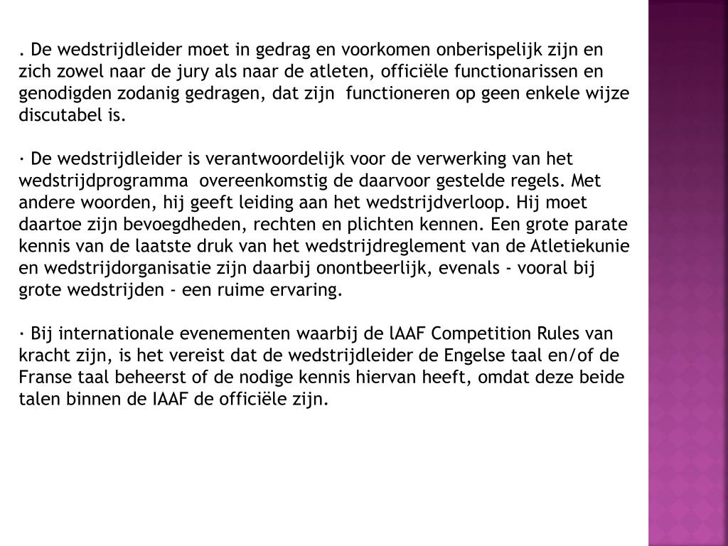 . De wedstrijdleider moet in gedrag en voorkomen onberispelijk zijn en zich zowel naar de jury als naar de atleten, officiële functionarissen en genodigden zodanig gedragen, dat zijn functioneren op geen enkele wijze discutabel is. · De wedstrijdleider is verantwoordelijk voor de verwerking van het wedstrijdprogramma overeenkomstig de daarvoor gestelde regels. Met andere woorden, hij geeft leiding aan het wedstrijdverloop. Hij moet daartoe zijn bevoegdheden, rechten en plichten kennen. Een grote parate kennis van de laatste druk van het wedstrijdreglement van de Atletiekunie en wedstrijdorganisatie zijn daarbij onontbeerlijk, evenals - vooral bij grote wedstrijden - een ruime ervaring. · Bij internationale evenementen waarbij de lAAFCompetitionRules van kracht zijn, is het vereist dat de wedstrijdleider de Engelse taal en/of de Franse taal beheerst of de nodige kennis hiervan heeft, omdat deze beide talen binnen de IAAF de officiële zijn.