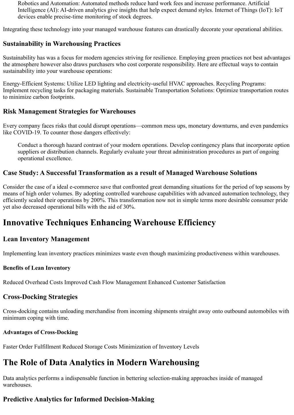 Robotics and Automation: Automated methods reduce hard work fees and increase performance. Artificial Intelligence (AI): AI-driven analytics give insights that help expect demand styles. Internet of Things (IoT): IoT devices enable precise-time monitoring of stock degrees. Integrating these technology into your managed warehouse features can drastically decorate your operational abilities. Sustainability in Warehousing Practices Sustainability has was a focus for modern agencies striving for resilience. Employing green practices not best advantages the atmosphere however also draws purchasers who cost corporate responsibility. Here are effectual ways to contain sustainability into your warehouse operations: Energy-Efficient Systems: Utilize LED lighting and electricity-useful HVAC approaches. Recycling Programs: Implement recycling tasks for packaging materials. Sustainable Transportation Solutions: Optimize transportation routes to minimize carbon footprints. Risk Management Strategies for Warehouses Every company faces risks that could disrupt operations—common mess ups, monetary downturns, and even pandemics like COVID-19. To counter those dangers effectively: Conduct a thorough hazard contrast of your modern operations. Develop contingency plans that incorporate option suppliers or distribution channels. Regularly evaluate your threat administration procedures as part of ongoing operational excellence. Case Study: A Successful Transformation as a result of Managed Warehouse Solutions Consider the case of a ideal e-commerce save that confronted great demanding situations for the period of top seasons by means of high order volumes. By adopting controlled warehouse capabilities with advanced automation technology, they efficiently scaled their operations by 200%. This transformation now not in simple terms more desirable consumer pride yet also decreased operational bills with the aid of 30%. Innovative Techniques Enhancing Warehouse Efficiency Lean Inventory Management Implementing lean inventory practices minimizes waste even though maximizing productiveness within warehouses. Benefits of Lean Inventory Reduced Overhead Costs Improved Cash Flow Management Enhanced Customer Satisfaction Cross-Docking Strategies Cross-docking contains unloading merchandise from incoming shipments straight away onto outbound automobiles with minimum coping with time. Advantages of Cross-Docking Faster Order Fulfillment Reduced Storage Costs Minimization of Inventory Levels The Role of Data Analytics in Modern Warehousing Data analytics performs a indispensable function in bettering selection-making approaches inside of managed warehouses. Predictive Analytics for Informed Decision-Making