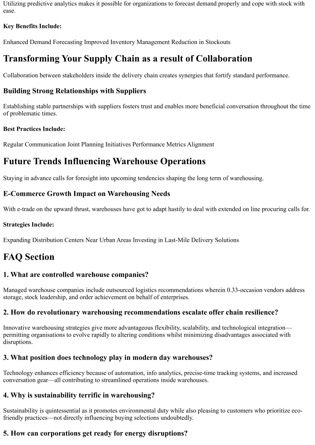Utilizing predictive analytics makes it possible for organizations to forecast demand properly and cope with stock with ease. Key Benefits Include: Enhanced Demand Forecasting Improved Inventory Management Reduction in Stockouts Transforming Your Supply Chain as a result of Collaboration Collaboration between stakeholders inside the delivery chain creates synergies that fortify standard performance. Building Strong Relationships with Suppliers Establishing stable partnerships with suppliers fosters trust and enables more beneficial conversation throughout the time of problematic times. Best Practices Include: Regular Communication Joint Planning Initiatives Performance Metrics Alignment Future Trends Influencing Warehouse Operations Staying in advance calls for foresight into upcoming tendencies shaping the long term of warehousing. E-Commerce Growth Impact on Warehousing Needs With e-trade on the upward thrust, warehouses have got to adapt hastily to deal with extended on line procuring calls for. Strategies Include: Expanding Distribution Centers Near Urban Areas Investing in Last-Mile Delivery Solutions FAQ Section 1. What are controlled warehouse companies? Managed warehouse companies include outsourced logistics recommendations wherein 0.33-occasion vendors address storage, stock leadership, and order achievement on behalf of enterprises. 2. How do revolutionary warehousing recommendations escalate offer chain resilience? Innovative warehousing strategies give more advantageous flexibility, scalability, and technological integration— permitting organisations to evolve rapidly to altering conditions whilst minimizing disadvantages associated with disruptions. 3. What position does technology play in modern day warehouses? Technology enhances efficiency because of automation, info analytics, precise-time tracking systems, and increased conversation gear—all contributing to streamlined operations inside warehouses. 4. Why is sustainability terrific in warehousing? Sustainability is quintessential as it promotes environmental duty while also pleasing to customers who prioritize eco- friendly practices—not directly influencing buying selections undoubtedly. 5. How can corporations get ready for energy disruptions?