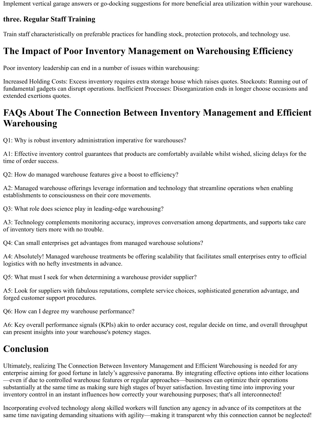 Implement vertical garage answers or go-docking suggestions for more beneficial area utilization within your warehouse. three. Regular Staff Training Train staff characteristically on preferable practices for handling stock, protection protocols, and technology use. The Impact of Poor Inventory Management on Warehousing Efficiency Poor inventory leadership can end in a number of issues within warehousing: Increased Holding Costs: Excess inventory requires extra storage house which raises quotes. Stockouts: Running out of fundamental gadgets can disrupt operations. Inefficient Processes: Disorganization ends in longer choose occasions and extended exertions quotes. FAQs About The Connection Between Inventory Management and Efficient Warehousing Q1: Why is robust inventory administration imperative for warehouses? A1: Effective inventory control guarantees that products are comfortably available whilst wished, slicing delays for the time of order success. Q2: How do managed warehouse features give a boost to efficiency? A2: Managed warehouse offerings leverage information and technology that streamline operations when enabling establishments to consciousness on their core movements. Q3: What role does science play in leading-edge warehousing? A3: Technology complements monitoring accuracy, improves conversation among departments, and supports take care of inventory tiers more with no trouble. Q4: Can small enterprises get advantages from managed warehouse solutions? A4: Absolutely! Managed warehouse treatments be offering scalability that facilitates small enterprises entry to official logistics with no hefty investments in advance. Q5: What must I seek for when determining a warehouse provider supplier? A5: Look for suppliers with fabulous reputations, complete service choices, sophisticated generation advantage, and forged customer support procedures. Q6: How can I degree my warehouse performance? A6: Key overall performance signals (KPIs) akin to order accuracy cost, regular decide on time, and overall throughput can present insights into your warehouse's potency stages. Conclusion Ultimately, realizing The Connection Between Inventory Management and Efficient Warehousing is needed for any enterprise aiming for good fortune in lately’s aggressive panorama. By integrating effective options into either locations —even if due to controlled warehouse features or regular approaches—businesses can optimize their operations substantially at the same time as making sure high stages of buyer satisfaction. Investing time into improving your inventory control in an instant influences how correctly your warehousing purposes; that's all interconnected! Incorporating evolved technology along skilled workers will function any agency in advance of its competitors at the same time navigating demanding situations with agility—making it transparent why this connection cannot be neglected!