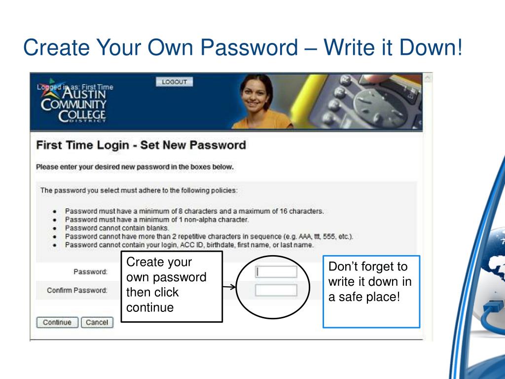 Create Your Own Password – Write it Down! Create your own password then click continue Don’t forget to write it down in a safe place!