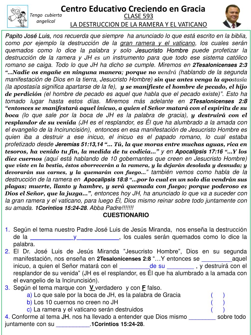 Centro Educativo Creciendo en Gracia CLASE 593 LA DESTRUCCION DE LA RAMERA Y EL VATICANO Tengo cubierta angelical • Papito José Luis, nos recuerda que siempre ha anunciado lo que está escrito en la biblia, como por ejemplo la destrucción de la gran ramera y el vaticano, los cuales serán quemados como lo dice la palabra y solo Jesucristo Hombre puede profetizar la destrucción de la ramera y JH es un instrumento para que todo ese sistema católico romano se caiga. Todo lo que JH ha dicho se cumple. Miremos en 2Tesalonicenses 2:3 “…Nadie os engañe en ninguna manera; porque no vendrá (hablando de la segunda manifestación de Dios en la tierra, Jesucristo Hombre) sin que antes venga la apostasía (la apostasía significa apartarse de la fe), y se manifieste el hombre de pecado, el hijo de perdición (el hombre de pecado es aquel que habla que el pecado existe)”. Esto ha tomado lugar hasta estos días. Miremos más adelante en 2Tesalonicenses 2:8“entonces se manifestará aquel inicuo, a quien el Señor matará con el espíritu de su boca (lo que sale por la boca de JH es la palabra de gracia), y destruirá con el resplandor de su venida (JH es el resplandor, es Él que ha alumbrado a la amada con el evangelio de la Inciruncisión), entonces en esa manifestación de Jesucristo Hombre es quien iba a destruir a ese inicuo, el inicuo es el papado romano, lo cual estaba profetizado desde Jeremías 51:13,14 “… Tú, la que moras entre muchas aguas, rica en tesoros, ha venido tu fin, la medida de tu codicia…” y en Apocalipsis 17:16 “…Y los diez cuernos (aquí está hablando de 10 gobernantes que creen en Jesucristo Hombre) que viste en la bestia, éstos aborrecerán a la ramera, y la dejarán desolada y desnuda; y devorarán sus carnes, y la quemarán con fuego…” también vemos como habla de la destrucción de la ramera en Apocalipsis 18:8 “…por lo cual en un solo día vendrán sus plagas; muerte, llanto y hambre, y será quemada con fuego; porque poderoso es Dios el Señor, que la juzga…”, entonces hoy JH, ha anunciado lo que va a suceder con la gran ramera y el vaticano, para luego Él, Dios mismo reinar sobre todo juntamente con su amada. 1Corintios 15:24-28. Abba Padre!!!!!!! • CUESTIONARIO • Según el tema nuestro Padre José Luis de Jesús Miranda, nos enseña la destrucción de la ____________ y ___________, los cuales serán quemados como lo dice la palabra. • El Dr. José Luis de Jesús Miranda ”Jesucristo Hombre”, Dios en su segunda manifestación, nos enseña en 2Tesalonicenses 2:8 “…Y entonces se _________aquel inicuo, a quien el Señor matará con el _________de su ________ , y destruirá con el resplandor de su venida” (JH es el resplandor, es Él que ha alumbrado a la amada con el evangelio de la Inciruncisión). • Según el tema marque con Vverdadero y con F falso. • a) Lo que sale por la boca de JH, es la palabra de Gracia ( ) • b) Los 10 cuernos no creen no JH( ) • c) La ramera y el vaticano serán destruidos ( ) • 4. Conforme al tema JH. nos ha llevado aentender que Dios mismo ________ sobre todo juntamente con su __________.1Corintios 15:24-28.
