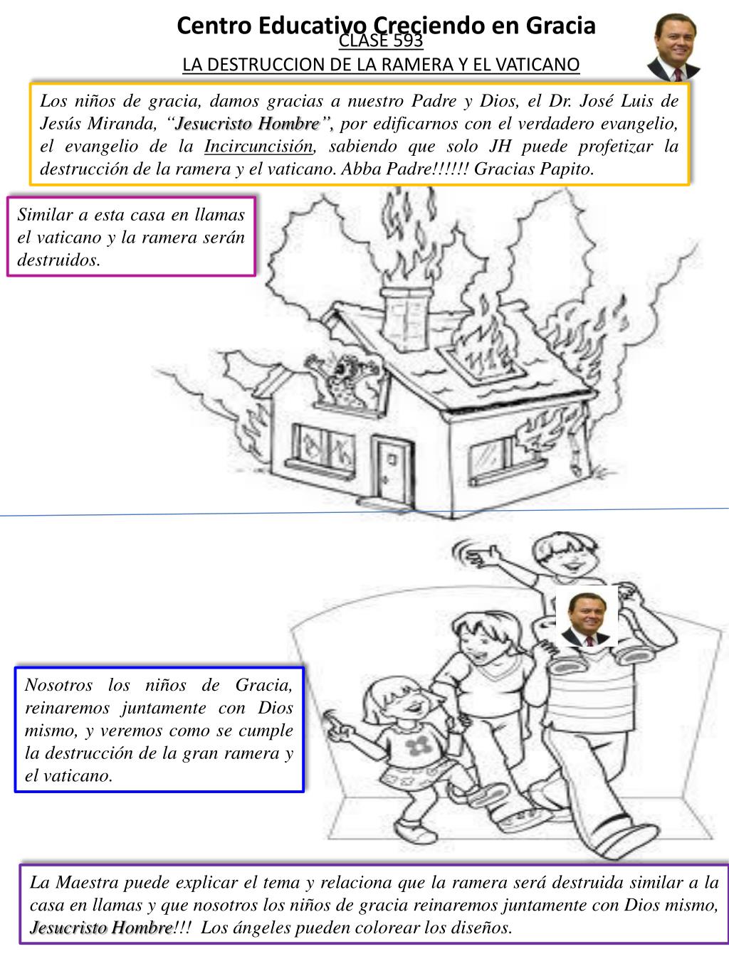 Centro Educativo Creciendo en Gracia CLASE 593 LA DESTRUCCION DE LA RAMERA Y EL VATICANO Los niños de gracia, damos gracias a nuestro Padre y Dios, el Dr. José Luis de Jesús Miranda, “Jesucristo Hombre”, por edificarnos con el verdadero evangelio, el evangelio de la Incircuncisión, sabiendo que solo JH puede profetizar la destrucción de la ramera y el vaticano. Abba Padre!!!!!! Gracias Papito. Similar a esta casa en llamas el vaticano y la ramera serán destruidos. Nosotros los niños de Gracia, reinaremos juntamente con Dios mismo, y veremos como se cumple la destrucción de la gran ramera y el vaticano. La Maestra puede explicar el tema y relaciona que la ramera será destruida similar a la casa en llamas y que nosotros los niños de gracia reinaremos juntamente con Dios mismo, Jesucristo Hombre!!! Los ángeles pueden colorear los diseños.