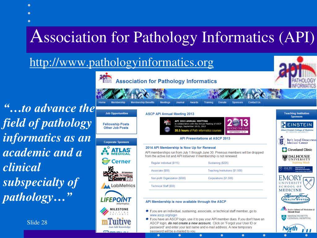 Association for Pathology Informatics (API)http://www.pathologyinformatics.org “…to advance the field of pathology informatics as an academic and a clinical subspecialty of pathology…” Slide 28