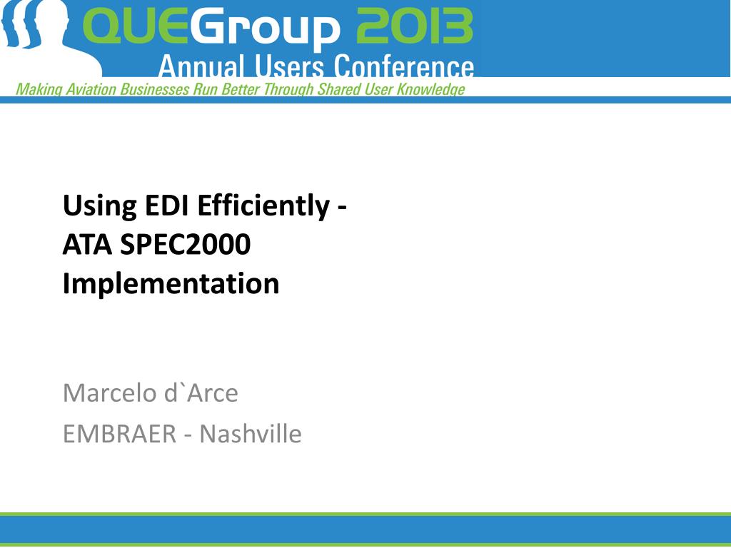 THE QUE GROUP WOULD LIKE TO THANK THE 2013 SPONSORS. Using EDI Efficiently - ATA SPEC2000 Implementation. Marcelo d`Arce EMBRAER - Nashville. Who am I … Marcelo d’Arce, Logistics and Tooling Director EAMS – EMBRAER Aircraft Maintenance Services Fully owned subsidiary of EMBRAER