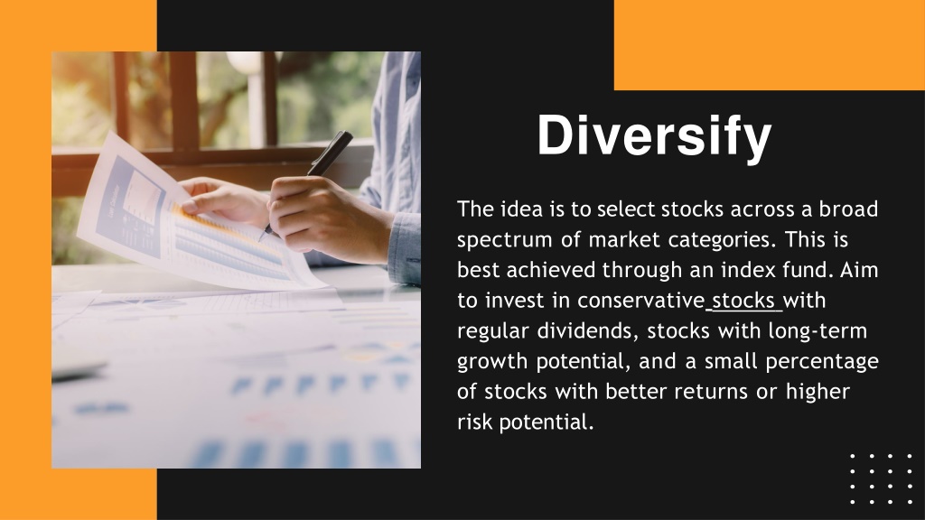 Diversify Theideaistoselectstocksacrossabroad spectrum of market categories. This is bestachievedthroughanindexfund.Aim to invest in conservativestockswith regular dividends, stocks with long-term growth potential, and a small percentage of stocks with better returns or higher riskpotential.