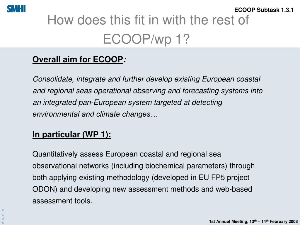 ECOOP Subtask 1.3.1 How does this fit in with the rest of ECOOP/wp 1? Overall aim for ECOOP: Consolidate, integrate and further develop existing European coastal and regional seas operational observing and forecasting systems into an integrated pan-European system targeted at detecting environmental and climate changes… In particular (WP 1): Quantitatively assess European coastal and regional sea observational networks (including biochemical parameters) through both applying existing methodology (developed in EU FP5 project ODON) and developing new assessment methods and web-based assessment tools. 2014-11-09 1st Annual Meeting, 13th – 14th February 2008