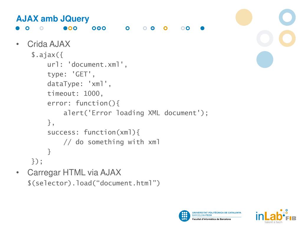 AJAX amb JQuery • Crida AJAX $.ajax({ url: 'document.xml', type: 'GET', dataType: 'xml', timeout: 1000, error: function(){ alert('Error loading XML document'); }, success: function(xml){ // do something with xml } }); • Carregar HTML via AJAX $(selector).load(“document.html”)