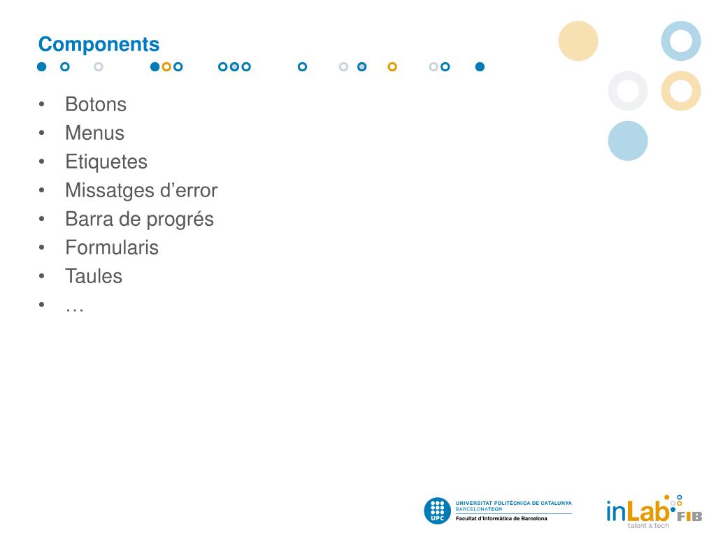 Components Botons Menus Etiquetes Missatgesd’error Barra de progrés Formularis Taules …