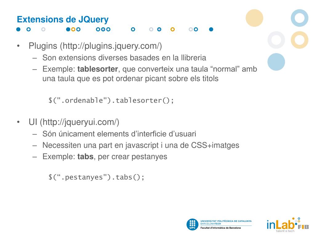 Extensions de JQuery • Plugins (http://plugins.jquery.com/) • Son extensions diverses basades en la llibreria • Exemple: tablesorter, que converteix una taula “normal” amb una taula que es pot ordenar picant sobre els titols $(".ordenable").tablesorter(); • UI (http://jqueryui.com/) • Són únicament elements d’interficie d’usuari • Necessiten una part en javascript i una de CSS+imatges • Exemple: tabs, per crear pestanyes $(“.pestanyes").tabs();